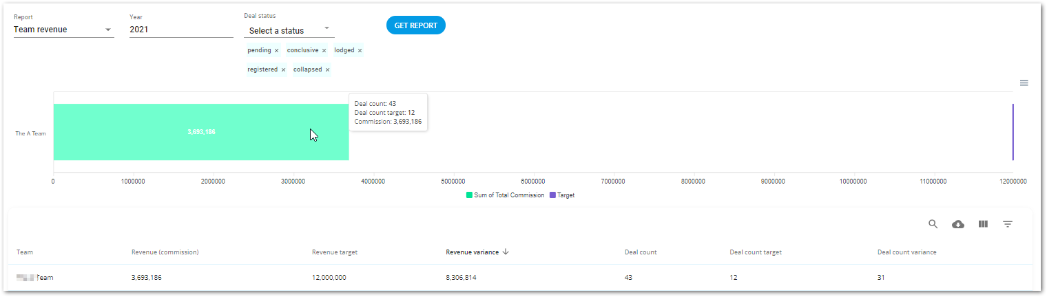 The Team Revenue report displays data for each Team in your office or group - for the Deal Status selected.