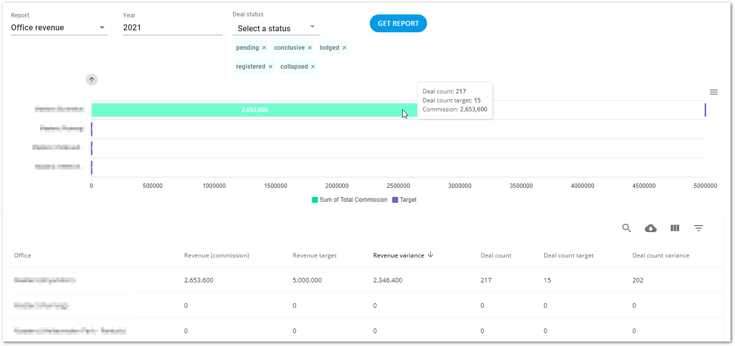 The Office Revenue report displays data for each office in your group – for the Deal Status selected.