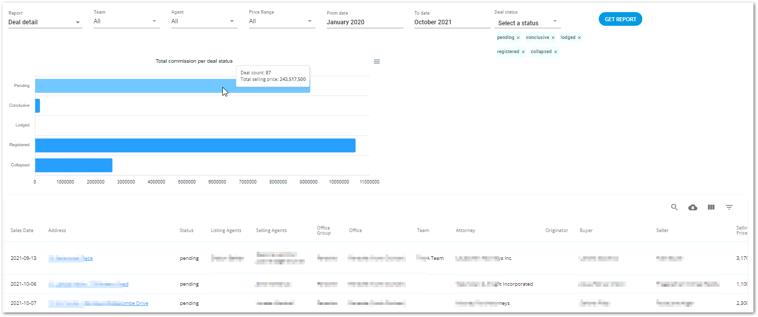 The breakdown below the graph displays the Total Selling Price per status. As previously shown, clicking on the address opens a Deal Audit report for the deal.