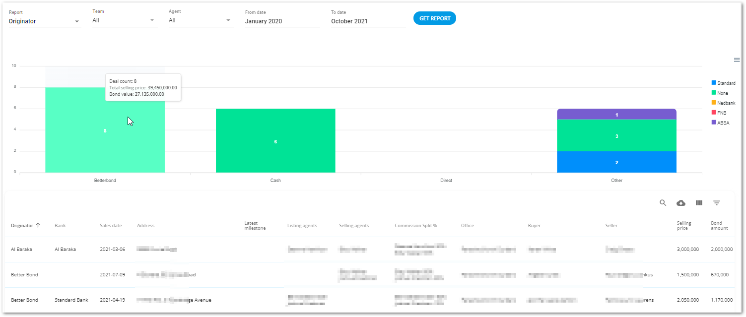 The Originator report displays the Bond Value per Originator and grantor, as well as the cash and direct amounts.