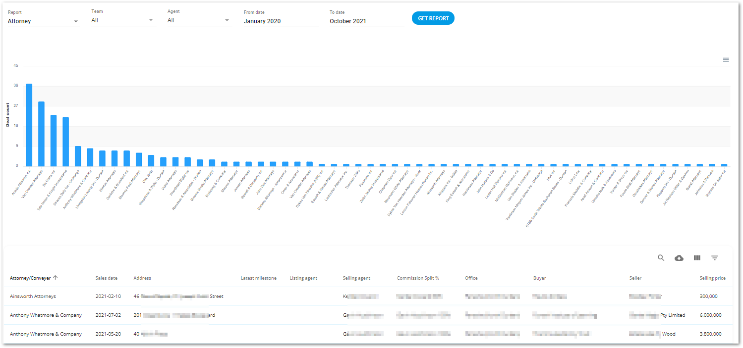 The Attorney report displays the Deal Count and Total Selling Price per Attorney.